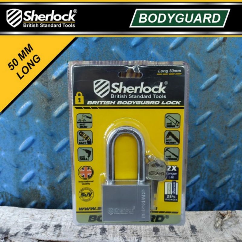 Gembok Bodyguard 50MM Long Sherlock(Tangkai Panjang) •British Standard Tools•Original (asli)•Gembok paling kuat dengan body terbuat dari baja (steel) •Anak kunci terbuat dari kuningan, setiap gembok diberikan 4 anak kunci•Tahan cuaca ekstrim •Anti acid, anti cut, anti drill, anti saw, anti hexkey, anti h
