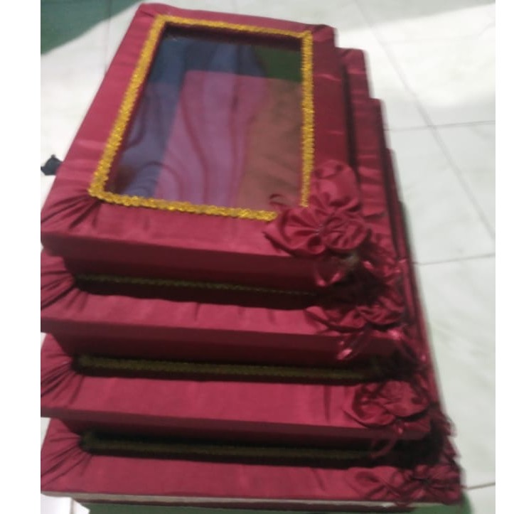 Cuma disini aja Kotak Hantaran/Seserahan ini dinding kotaknya berbahan triplekBox Seserahan / Kotak Hantaran Pita1 set isi 4 KotakTanya stok warna sebelum membeli yah Deskripsi ukuran masing-masing Kotak antara lain :1. Ukuran yg paling besar : 46 × 37 × 12 cm2. Ukuran box ke-2 : 41 × 32 × 10 cm3. Ukuran box ke-3 : 36 × 27 × 9 cm4. Ukuran yg paling kecil : 31 × 22 × 8 cmKeterangan:* Pilihan warna : Maroon, coklat gold, silver, hijau toska, biru* Seserahan ini sudah di lengkapi tutupKeterangan:* Berat barang untuk produk memakai berat Volumetrik.karena berat aslinya lebih rendah dari pada berat Volume nya.Berat aslinya 1,5kg, sedangkan Berat Volumetrik nya 3,6kgJika ada yang ingin ditanyakan silahkan chat yaahh HAPPY SHOPPING Untuk yg diluar bekasi bisa menggunakan JNE tracking, tapi risiko pengiriman barang akan lama sampai.#boxseserahan#kotakseserahan#boxhantaran#kotakhan