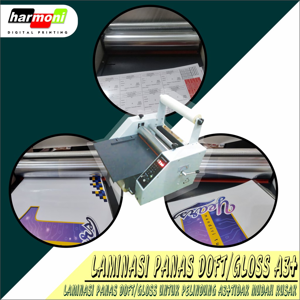 Laminasi panas doff/gloss untuk pelindung A3+ agar tidak mudah rusak.Jam operasional:Senin - Sabtu.. 09.00 - 21.00 WIBMinggu dan tanggal merah.. libur..Pesanan diluar jam operasional.. dikerjakan pada keesokan harin