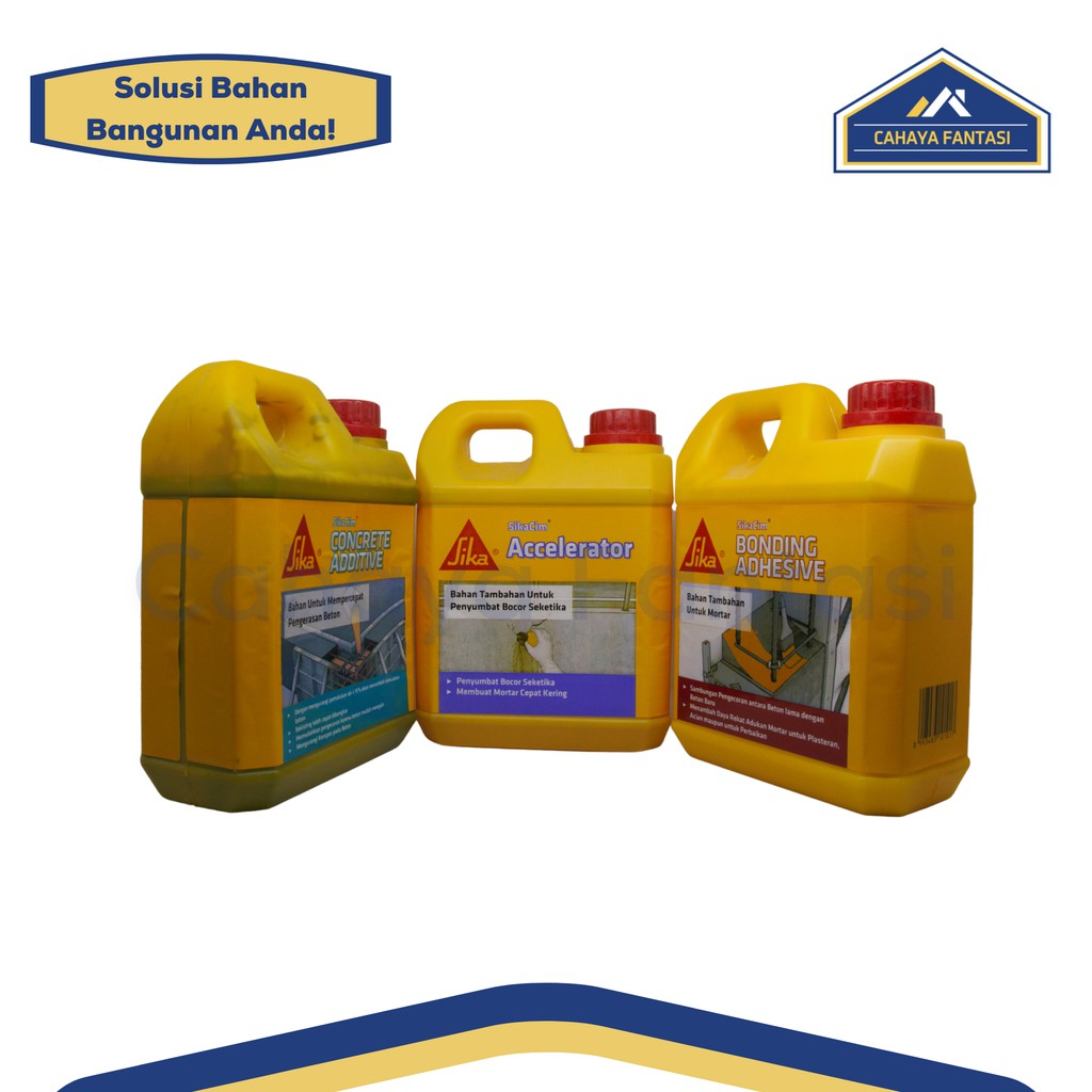 Toko Cahaya Fantasi Merupakan Toko Bahan Bangunan yang Menyediakan Berbagai Keperluan Bahan Bangunan Anda Sejak Tahun 1991Tidak tersedia pengiriman ke luar pulau Jawa (cairan)SikaCim Ukuran 900ml- Concrete Additive = material superplastisizer yang dapat mengurangi penggunaan air di beton (+- 15%). Bahan untuk mempercepat pengerasan betonKelebihan =1. Pengurangan air sebanyak 15% akan menambah kekuatan beton2. Bekisting lebih cepat dibongkar3. Memudahkan pengecoran karena beton mudah mengalir4. Mengurangi keropos pada betonCara Penggunaan = ada dalam kemasanWarna Coklat Tua- Bonding Adhesive = Bahan tambahan untuk mortarKelebihan =1. Sambungan pengecoran antara beton lama dengan beton baru2. Menambah daya rekat adukan mortar untuk plasteran,acian maupun perbaikanCara Penggunaan =Sambungan beton lama dengan beton baru- Campurkan Sikacim dengan rasio Bonding Adhesive : Air : Semen = 1:1:2, aduk hingga merata- Oleskan campuran ke permukaan beton lama yang sudah dilembabkan- Segera cor beton baru ketika campuran perekat masih basahUntuk adukan mortar =- Campurkan Sikacim dengan rasio Bonding Adhesive : Air = 1:2, aduk hingga merata- Gunakan sebagai air pencampur untuk adukan semen : pasir = 1:3 (mortar) sampai kekentalan yang dikehendakiWarna Putih- Accelerator = Bahan tambahan untuk penyumbat bocor seketikaKelebihan =1. Penyumbat bocor seketika2. Membuat mortar cepat keringCara Penggunaan =Sebagai penyumpat kebocoran seketika- Campurkan Sikacim dengan rasio Accelerator : semen = 1:3, aduk hingga rata sampai berbentuk pasta- Tempelkan dan tekan campuran berbentuk pasta ke lubang dimana air keluar- Tahan beberapa saat hinga pasta mengerasSebagai adukan mortar cepat kering- Campurkan Sikacim dengan rasio Accelerator : Air = 1:2- Gunakan sebagai air pencampur untuk adukan semen dan pasirWarna TransparanApakah Anda Membutuhkan Bahan Bangunan Lainnya? Jangan Ragu Untuk Menghubungi Kami!#CahayaFantasi #SolusiBahanBanguna