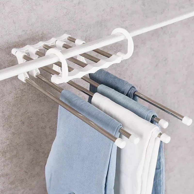 【5 in 1 Gantungan celana multifungsi】Nama Produk: Gantungan celana multifungsiWarna: Hitam, Putih Ukuran: 34x14.5x6.5 cmBerat: 180 gMaterial: PP, Baja anti karatGantungan celana dengan desain teleskopik, dapat menghemat ruangan dengan model gantung horizontal dan ver