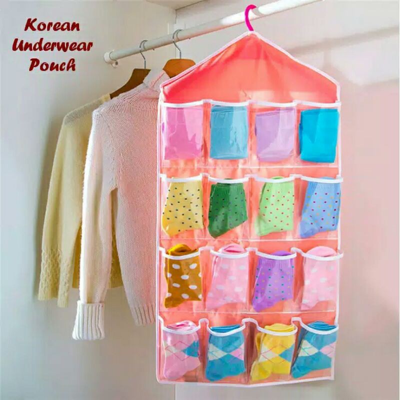Pouch Hanging Organizer 16 Sekat Korean Set Tempat Celana Dalam Gantung adalah solusi buat anda yang ingin menyimpan barang atau celana dalam jadi tersimpan rapi dan mudah diambil saat hendak dipakai.Pouch terdiri dari 16 sekat transparan, tiap sekat dapat di isi 3-4 pcs celana dalam.Pouch dapat digantung ke hanger, mumudahkan untuk digantung di dalam lemari. Bagian atas terdapat lobang untuk hanger.Selain untuk tempat panties, pouch juga dapat digunakan untuk tempat menyimoan aksesoris. Dengan sekat yang cukup banyak, bisa diisi dengan aneka aksesoris seperti kalung, gelang, anting dan pernak pernik lainnya. Bahan : Polyester anti air. Sekat bahan plastik transparanTidak ada hangernya.Ukuran: 42 cm x 76 cm#underwearpouch#hangingorganizer#gantungan #organizertas#storagebox#homeorga