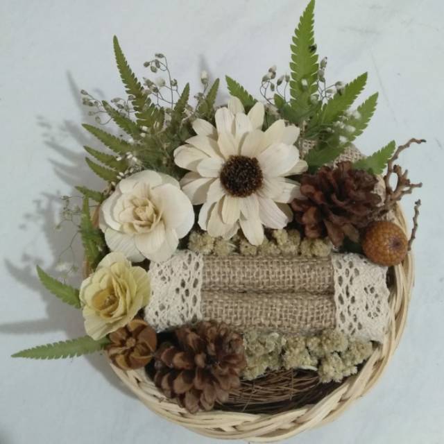 keranjang UK 13-15 cm dengan bunga bunga kering bertema rusticharga belum termasuk inisial nama dan nampan kayu untuk penambahan inisial atau cetak nama silahkan co dengan nama pada list produk kami check out tanpa nama atau inisial kita kirim Pinus ya